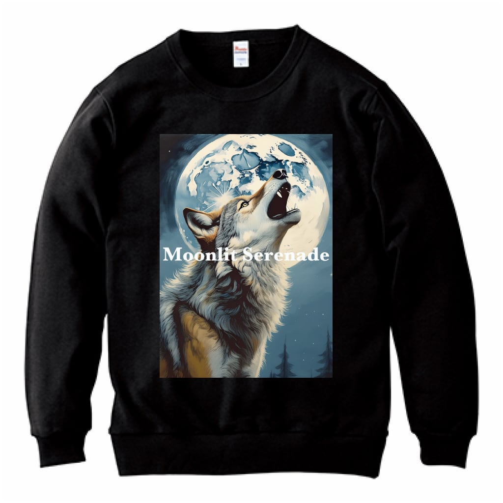月明かりの下、遠吠えするオオカミの力強い姿を捉えたトレーナです。神秘的な夜の静寂と、生命の息吹を感じさせるデザインが、あなたの日常に野生の美しさをもたらします。さ自然を愛する方や、個性的なスタイルを求める方にぴったりの一枚です。