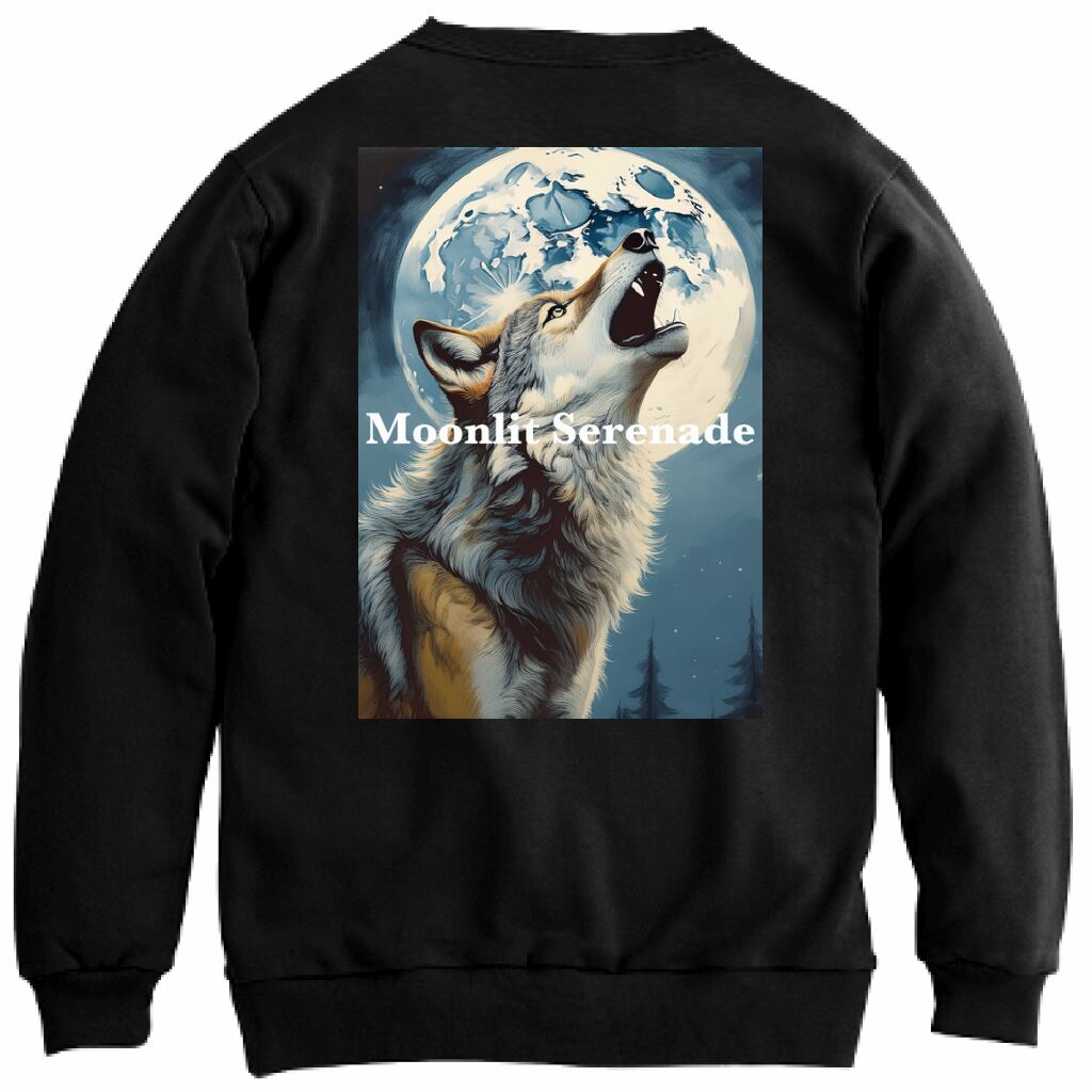 月明かりの下、遠吠えするオオカミの力強い姿を捉えたトレーナです。神秘的な夜の静寂と、生命の息吹を感じさせるデザインが、あなたの日常に野生の美しさをもたらします。さ自然を愛する方や、個性的なスタイルを求める方にぴったりの一枚です。
