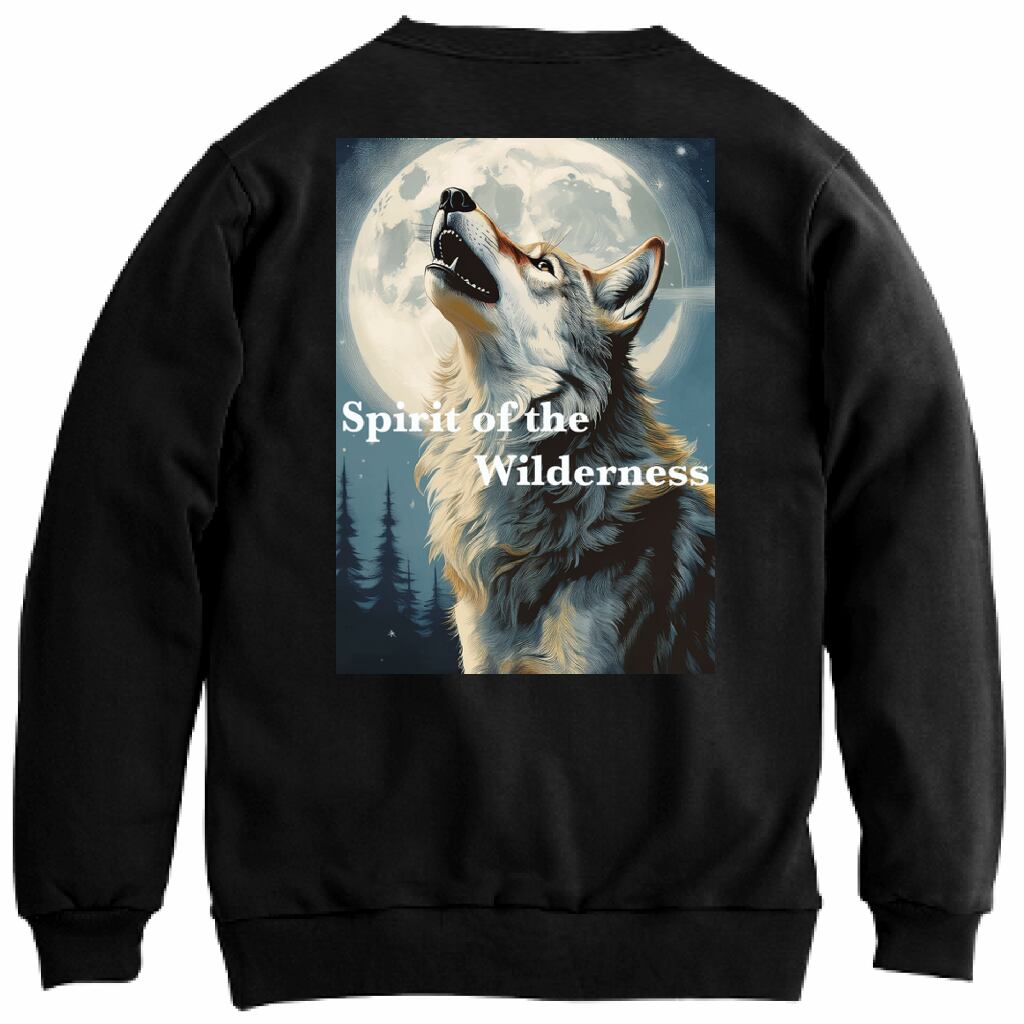 夜空に浮かぶ満月を背に、力強く遠吠えするオオカミ。このトレーナーは、神秘的な夜の静寂と野生の魂を感じさせるデザインです。