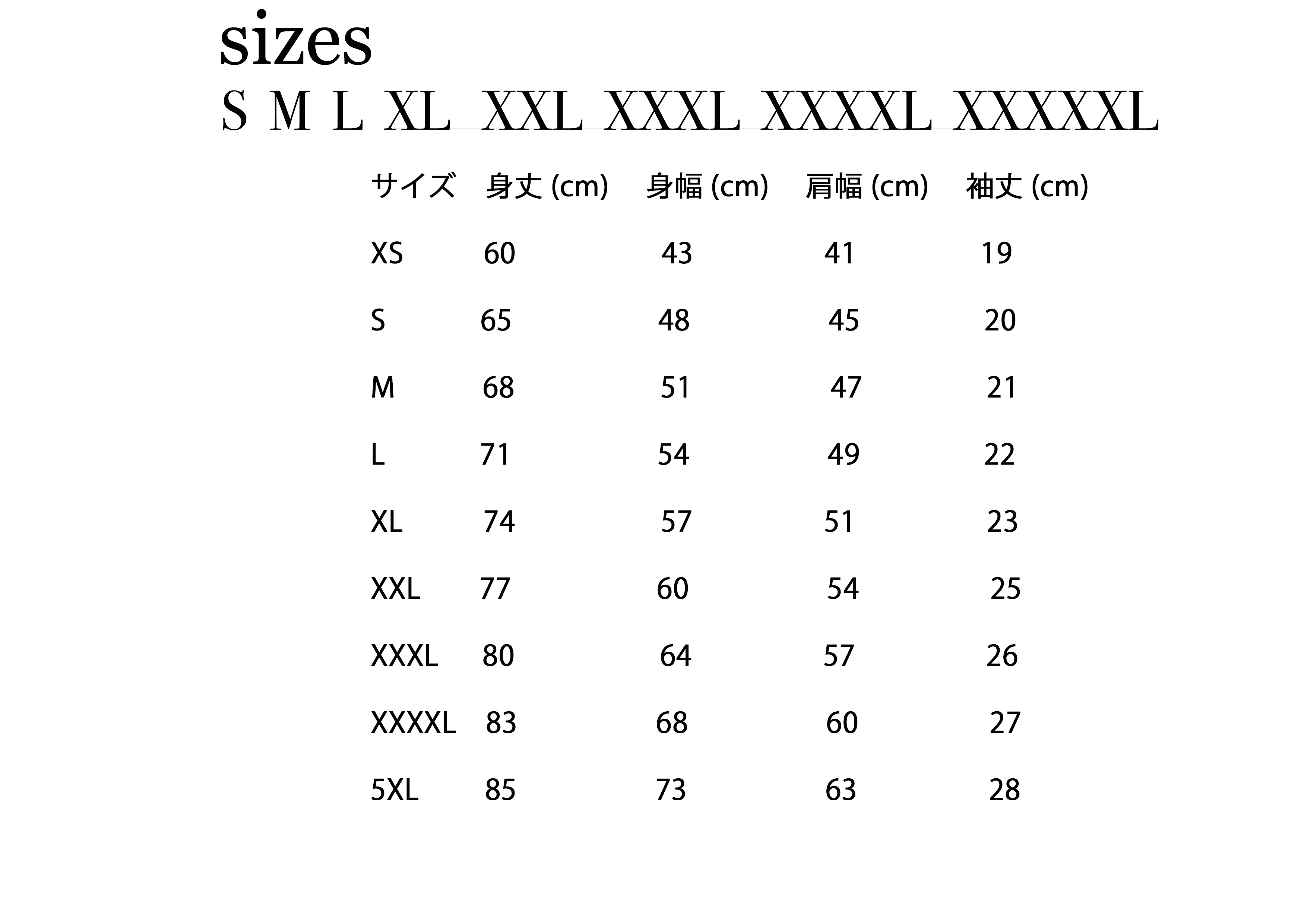 XS / S / M / L / XL / XXL / XXXL / XXXXL(5XL)
