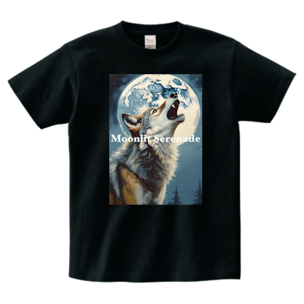 月明かりの下、遠吠えするオオカミの力強い姿を捉えたTシャツです。神秘的な夜の静寂と、生命の息吹を感じさせるデザインが、あなたの日常に野生の美しさをもたらします。自然を愛する方や、個性的なスタイルを求める方にぴったりの一枚です。